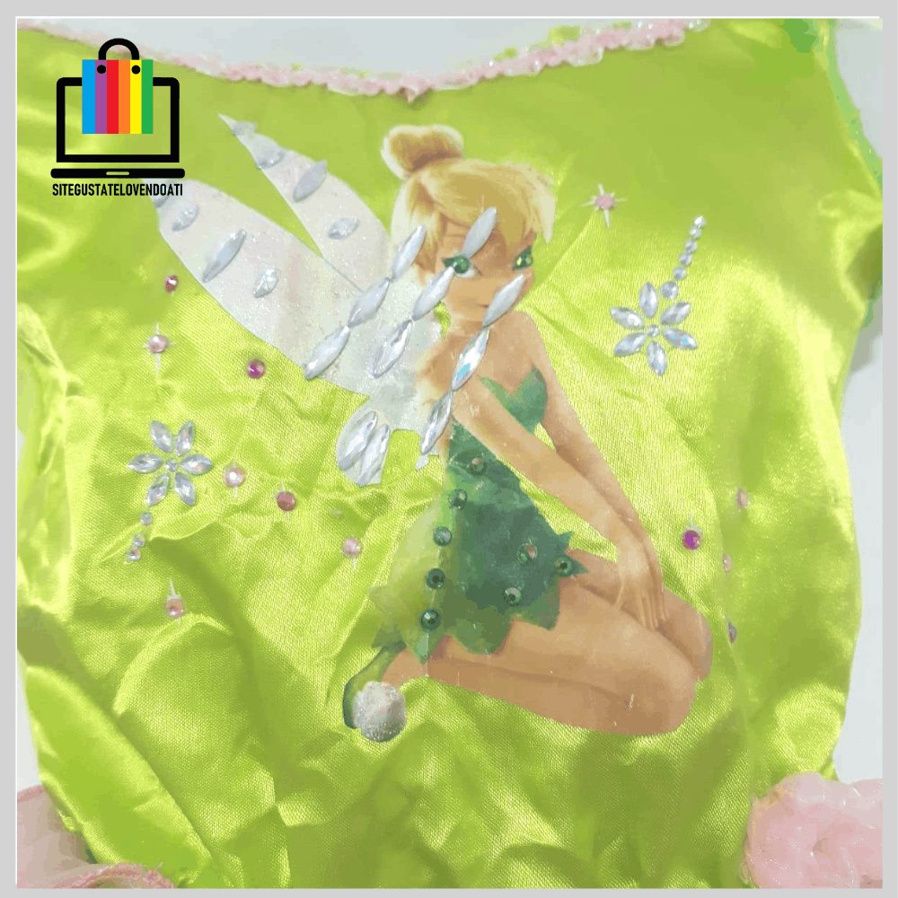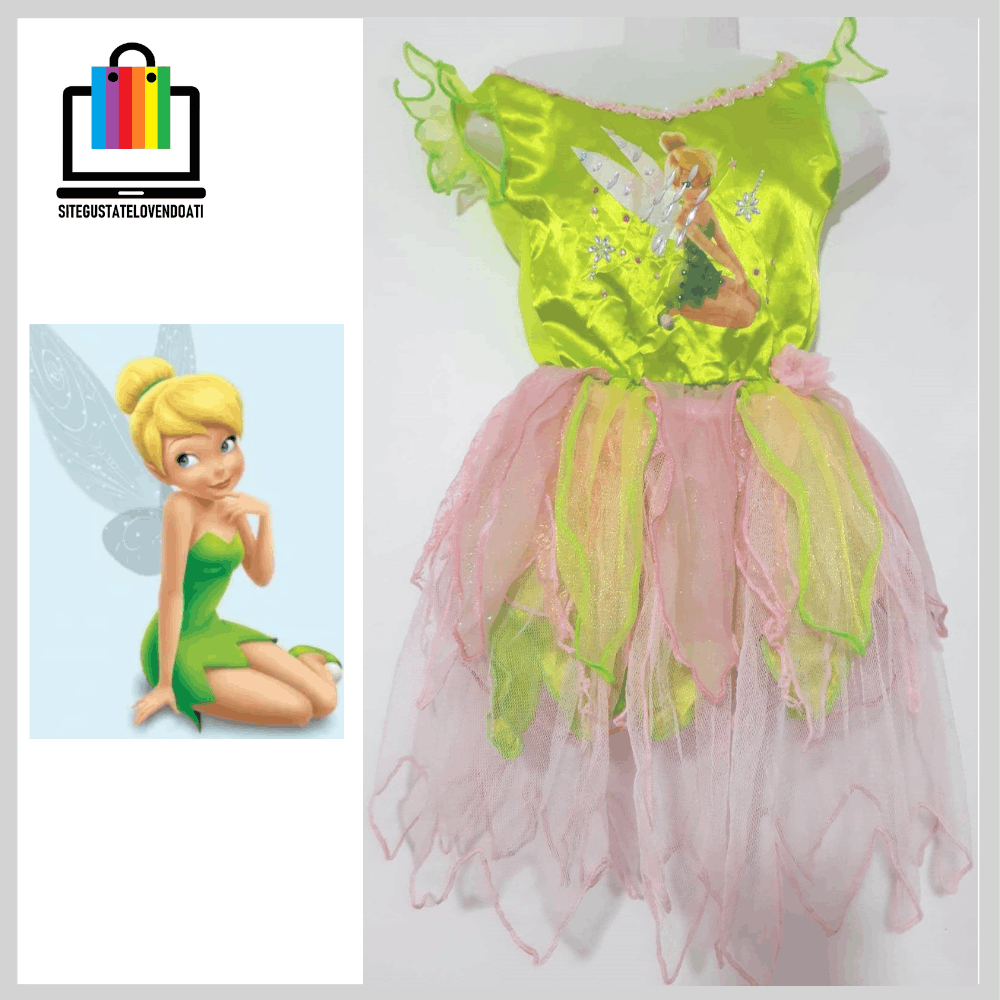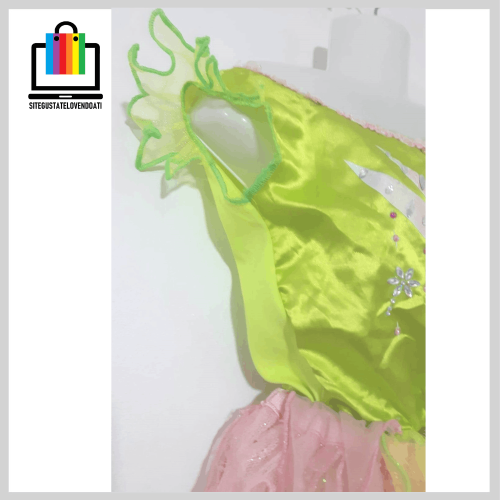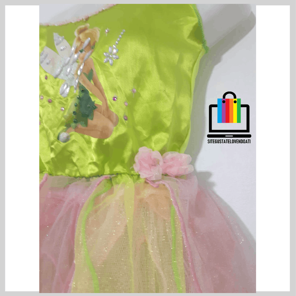 | ✅Disfraz Vestido Campanitas. ✅Elegante vestido fabricado en suaves telas, decoradas con brillos. ✅Disponible en talla: 3-4-5-6. ✅En la parte inferior posee tul verde y rosado con terminaciones en overlok. ✅La parte superior esta fabricada de tela verde brillante, con impresión de campanitas y decorada con brillos. |