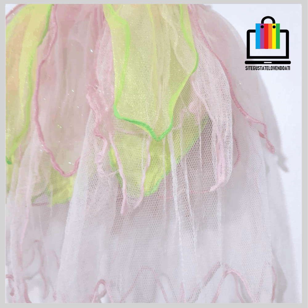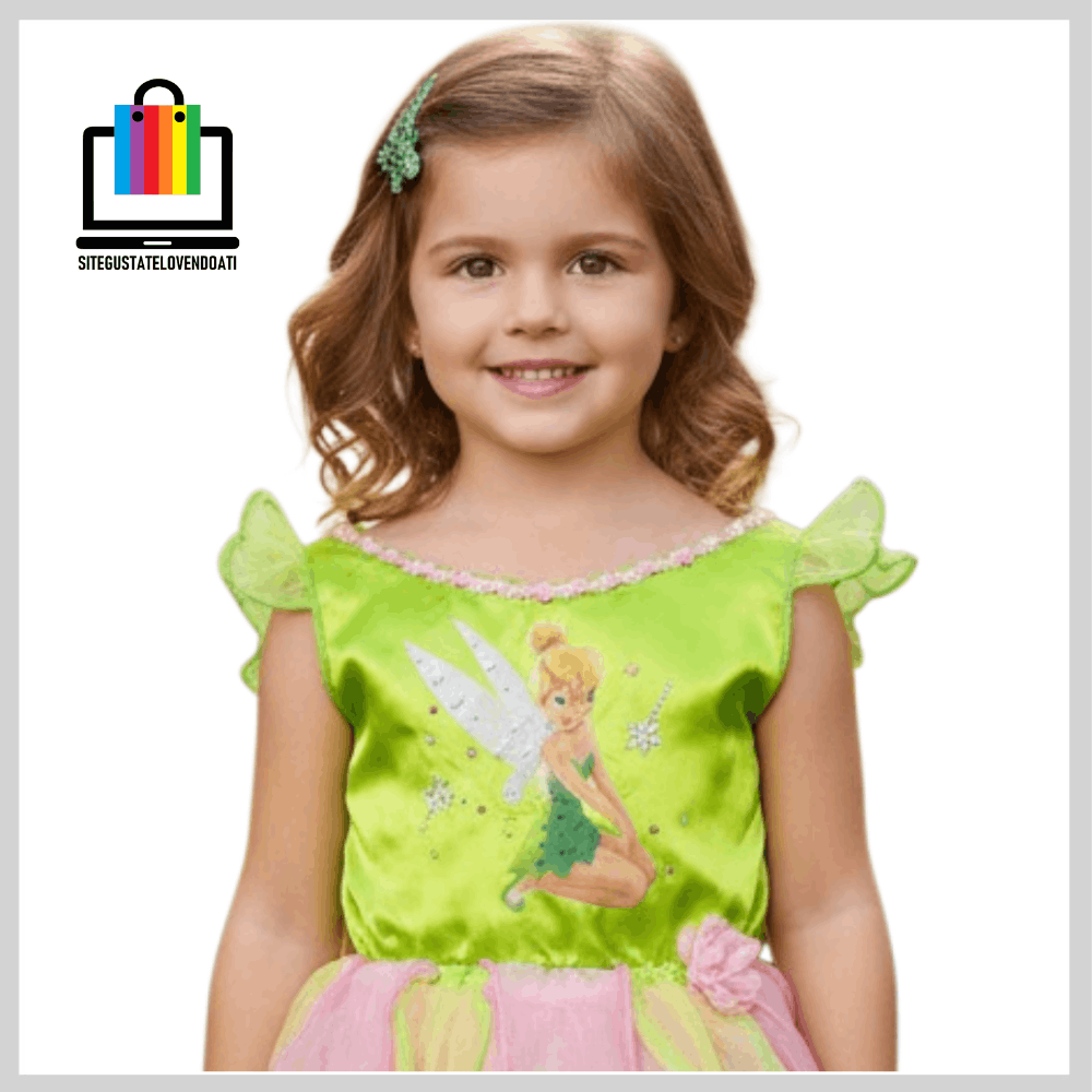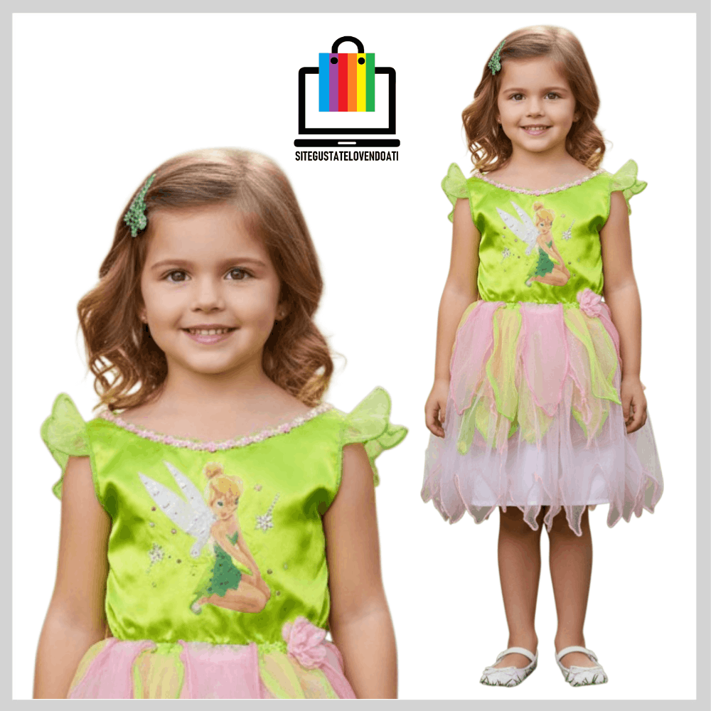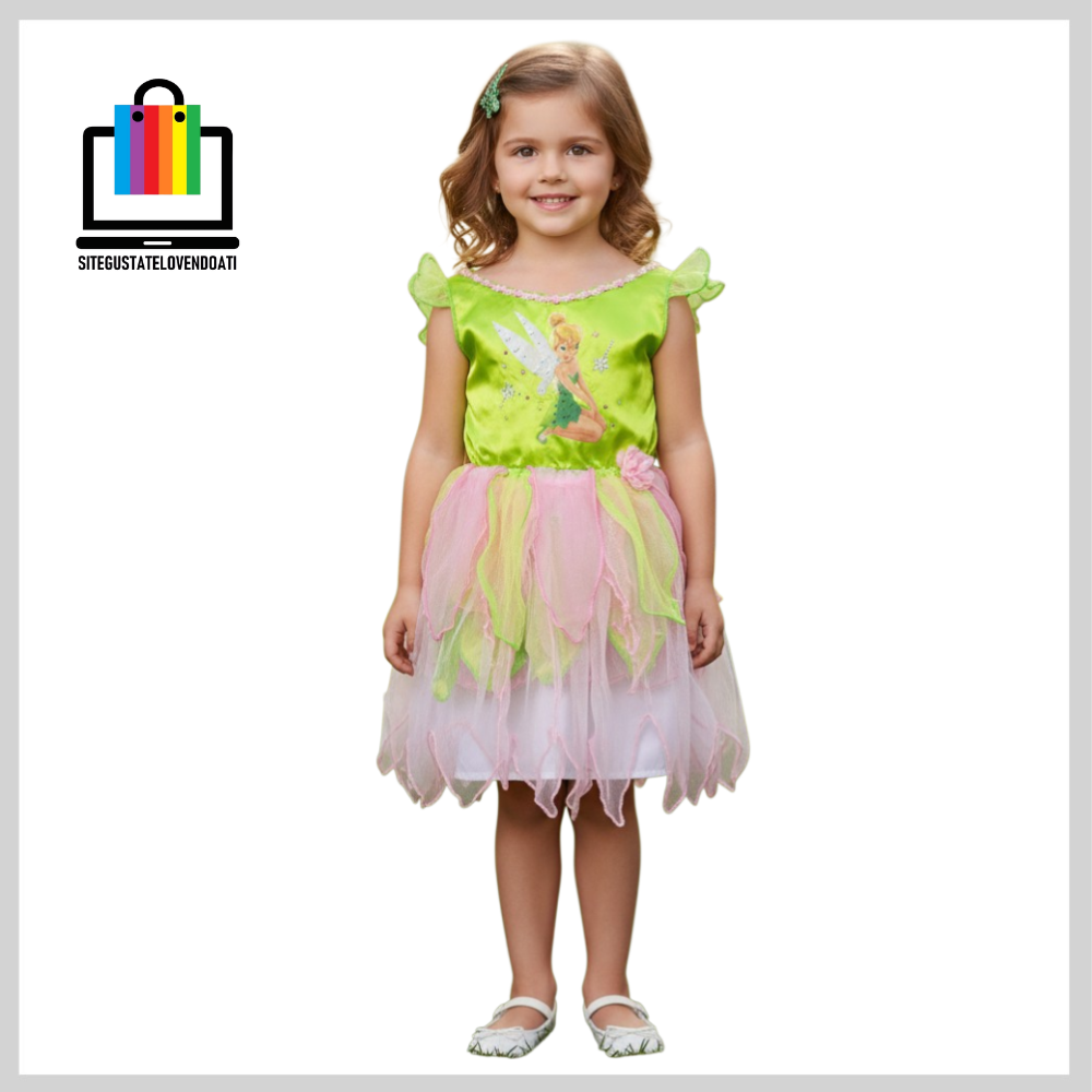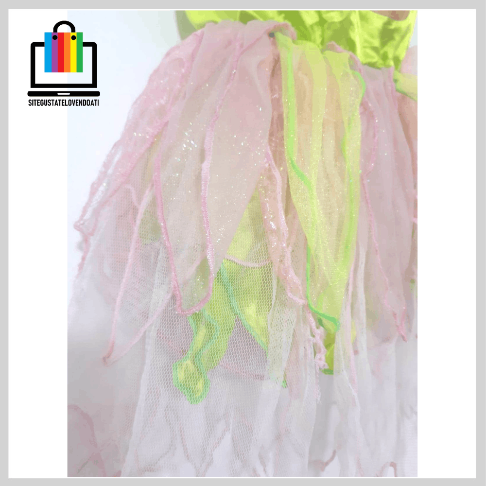 | ✅Disfraz Vestido Campanitas. ✅Elegante vestido fabricado en suaves telas, decoradas con brillos. ✅Disponible en talla: 3-4-5-6. ✅En la parte inferior posee tul verde y rosado con terminaciones en overlok. ✅La parte superior esta fabricada de tela verde brillante, con impresión de campanitas y decorada con brillos. |